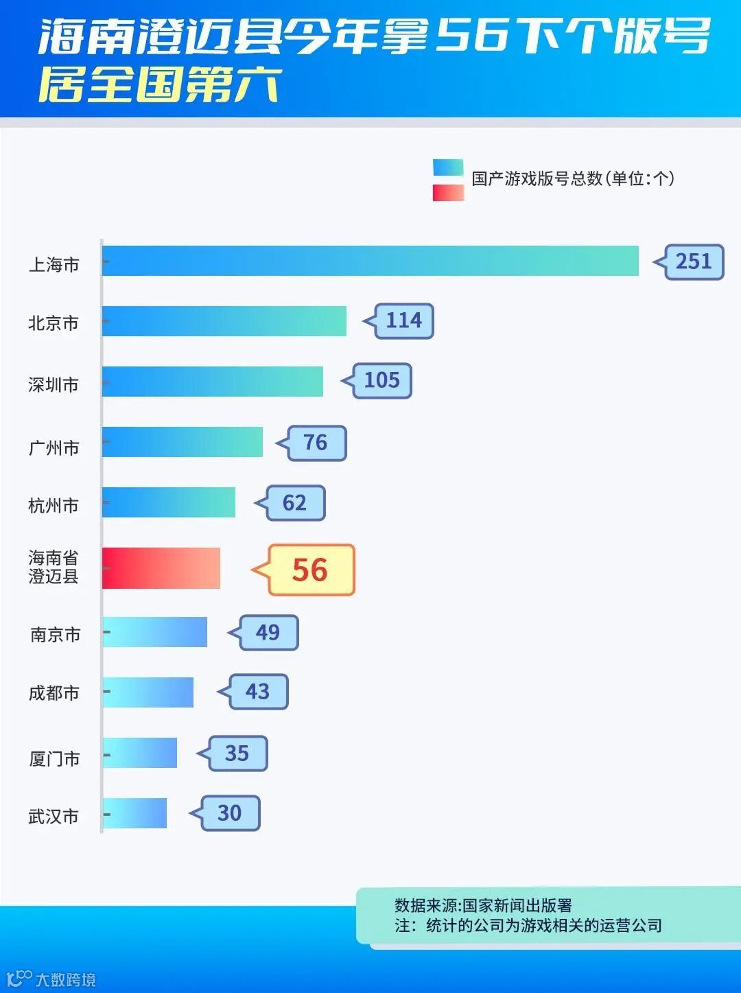 尤其是海南澄迈县,今年在这里的公司一共斩获了56个国产游戏版号,排在全国城市第六。这里共有48家企业拿到了游戏版号,居全国第五,仅次于北上广深。而海南的乐东黎族自治县,今年也拿到了17个版号,排在全国城市第11位。