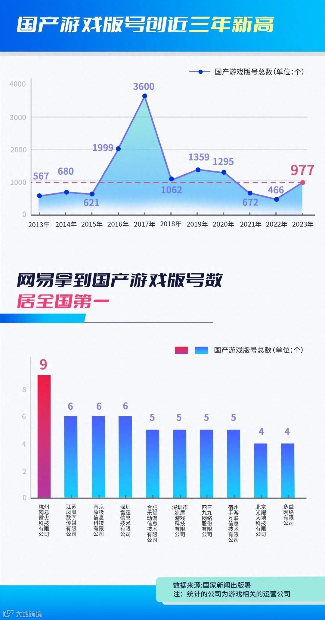 游戏版号发放的多寡是游戏行业发展的“晴雨表”。在游戏版号和过审公司数量双双回暖的时刻,九派新闻记者梳理了十年来国产游戏累计1.32万个游戏版号的归属,试图找出谁才是国产游戏的“头号玩家”。