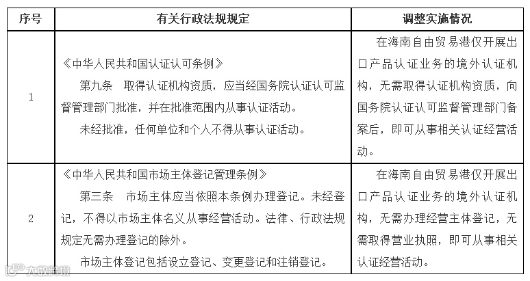 一、为支持海南自由贸易港建设,按照《海南自由贸易港建设总体方案》,同意自即日起在海南自由贸易港暂时调整实施《中华人民共和国认证认可条例》、《中华人民共和国市场主体登记管理条例》有关规定(目录附后),在海南自由贸易港仅开展出口产品认证业务的境外认证机构,无需取得认证机构资质和办理经营主体登记,向国务院认证认可监督管理部门备案后,即可开展出口产品认证业务,认证结果仅限出口企业境外使用。备案条件和程序由国务院认证认可监督管理部门制定。