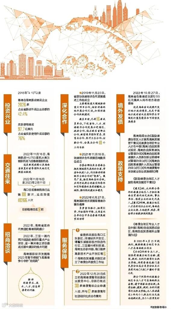 近年来,省政协组建琼港经济合作发展推进工作组和10个工作专班,推动成立琼港经济合作发展咨询委员会、海南国际经发局香港办事处,促进琼港经贸合作。省委统战部在6个海南自贸港重点园区设立港澳台侨服务工作站,向在琼投资创业的香港人士提供便捷化服务。