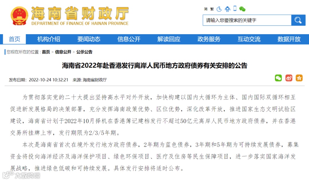 10月24日,海南省财政厅发布公告称,海南省计划于2022年10月择机在香港簿记建档发行不超过50亿元离岸人民币地方政府债券,并在香港交易所挂牌上市,发行期限为2/3/5年期。