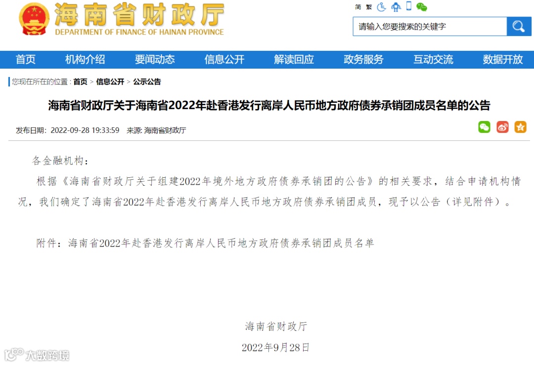 2022年9月28日,海南省财政厅发布了《海南省关于海南省2022年赴香港发行离岸人民币地方政府债券承销团成员名单的公告》,确定了海南省2022年赴香港发行离岸人民币地方政府债券承销团成员名单。本次海南省财政厅公布的赴港债券承销团成员名单共有17家金融机构,其中包括中国银行(香港)有限公司等11家银行机构,以及国泰君安证券(香港)有限公司等证券机构。