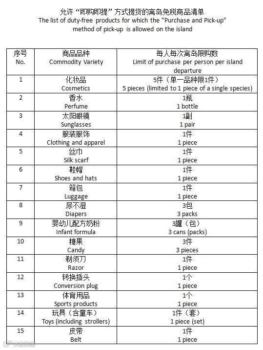 When purchasing duty-free goods in Hainan’s offshore duty-free shops (excluding online sales platforms) with valid identity documents or travel documents along with departing information,besides picking up at the designated areas at airports, railway stations, wharfs, via postal delivery or when local residents returning to the island,tourists who purchase duty-free goods with a unit price over 50,000 yuan (included) could choose to use the “Pick-up upon Guarantee” mode.The “Pick-up upon Purchase” mode is available for duty-free goods with a unit price less than 20,000 yuan (excluding) that are listed in the Annex of the announcement. It is important to note that duty-free goods purchased using these new pick-up methods are for personal use only and must be taken off the island in one go. Any reselling of these goods is strictly prohibited.
