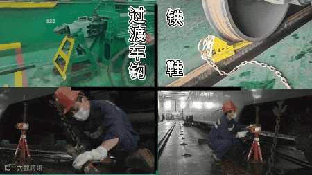 火车推送上船后,采用过渡车钩、铁鞋、绑扎铁链、垂直螺杆支撑器等4种绑扎固定方式,将列车牢牢固定在船舶上。