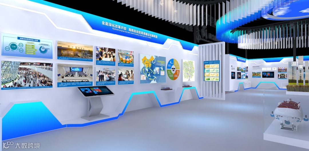 麻雀虽小,五脏俱全,在面积不大的“海南馆”中,别具一格历史长河的画卷随着渐变蓝色灯效的蔓延缓缓展开。海南在推进全面深化改革开放和中国特色自由贸易港建设的实践中,清晰形成了"—本三基四梁八柱”战略框架,为其发展提供了有力指引。海南自由贸易港核心政策围绕着“三税”“五自由便利”“一安全有序流动”稳步开展相关建设工作,致力于打造国内国际双循环的重要交汇点。