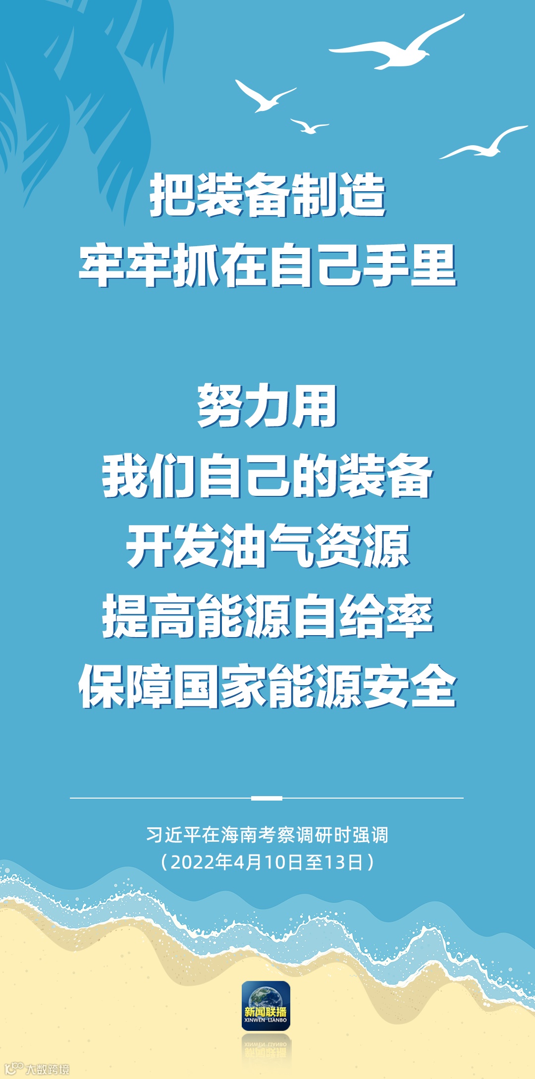 随后,习近平来到中国海洋大学三亚海洋研究院,了解海洋观测设备与信息服务系统研发应用情况,连线“深海一号”作业平台。前方工作人员向总书记汇报了一线工作情况。习近平向他们表示诚挚问候,嘱咐他们注意安全、保重身体。习近平强调,建设海洋强国是实现中华民族伟大复兴的重大战略任务。要推动海洋科技实现高水平自立自强,加强原创性、引领性科技攻关,把装备制造牢牢抓在自己手里,努力用我们自己的装备开发油气资源,提高能源自给率,保障国家能源安全。