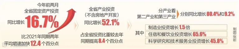 具体来看,产业投资高速增长,投资结构持续优化。1月至2月,全省固定资产投资同比增长16.7%,比2021年同期两年平均增速加快12.4个百分点。其中非房地产开发投资同比增长24.2%,占固定资产投资比重较去年同期提高3.8个百分点。全省产业投资(不含房地产开发)同比增长52.1%,占全省投资比重较去年同期提高8.4个百分点。分产业看,第二产业和第三产业分别同比增长80.4%和9.2%,其中制造业投资增长1.5倍,住宿和餐饮业投资增长65.6%,科学研究和技术服务业投资增长45.8%,卫生、社会保障和社会福利业投资增长56.1%。