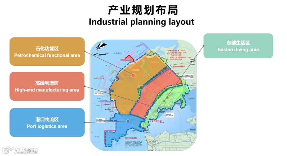 洋浦经济开发区的发展规划主要分为4部分:港口物流区、石化功能区、高端制造区及东部生活区(详见下图),分别对应物流、石化、制造及商贸和零售产业的发展。港口物流区及石化功能区沿海而建,面朝北部湾,分别建有集装箱及石油码头,连接洋浦保税港区及石油炼化和储存基地。高端制造区位于港口物流区以北,方便企业经港口取得原料进行加工工序,及将制成品经海路运离洋浦。东部生活区与洋浦经济开发区的主要交通干道最近,方便居民利用洋浦跨海大桥等道路往来洋浦及儋州其他地区。