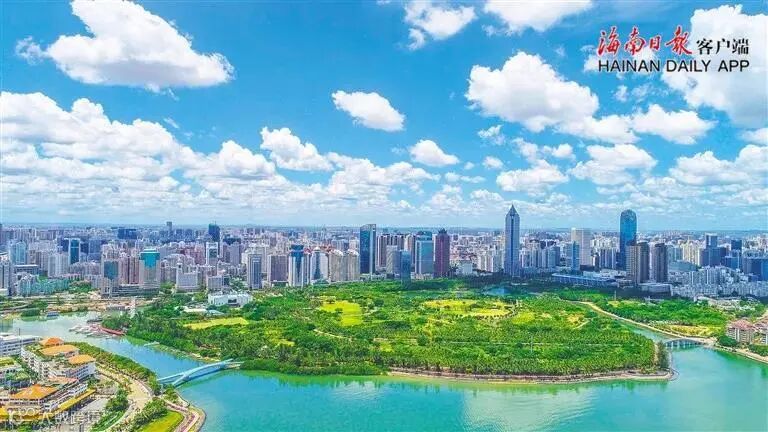 海南自贸港建设蓬勃展开,城市发展欣欣向荣。图为蓝天白云下的海口万绿园一带。海南日报记者 张茂 摄