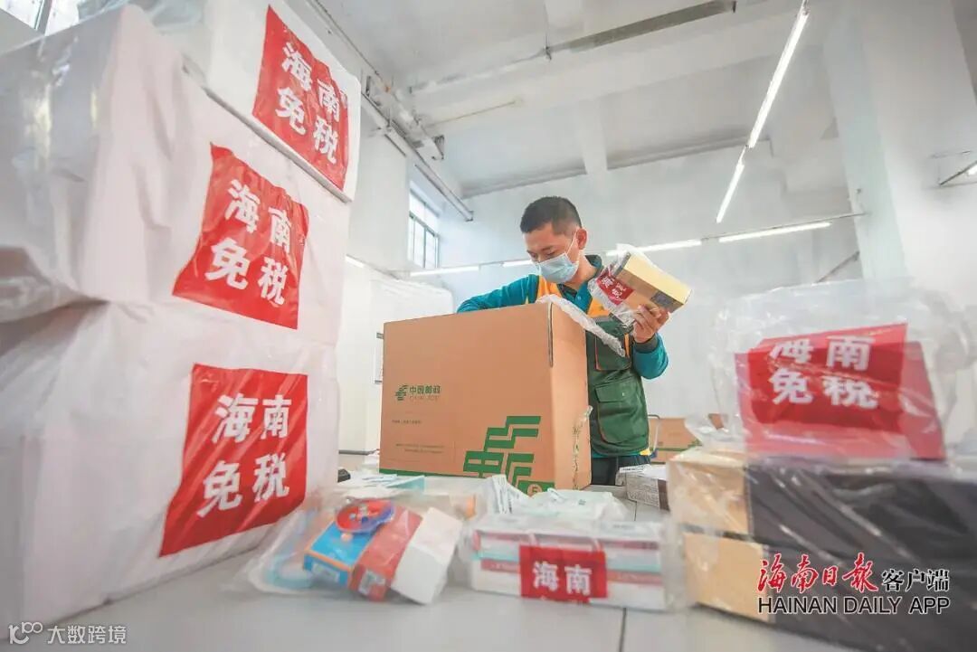 在中国邮政集团公司海口市分公司的离岛免税品邮寄送达处理中心,工作人员正在对免税品打包。海南日报记者 袁琛 摄