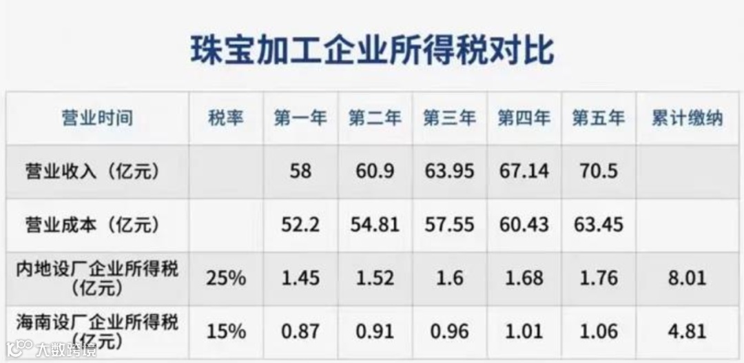 以珠宝加工企业经营发展五年为基数,相较内地成立公司,海南自由贸易港成立公司可累计节省约3.2亿元。此外,珠宝进口加工企业高层人员(1%-3%)如年薪超47万元还可享受个人所得税优惠堿免政策红利。