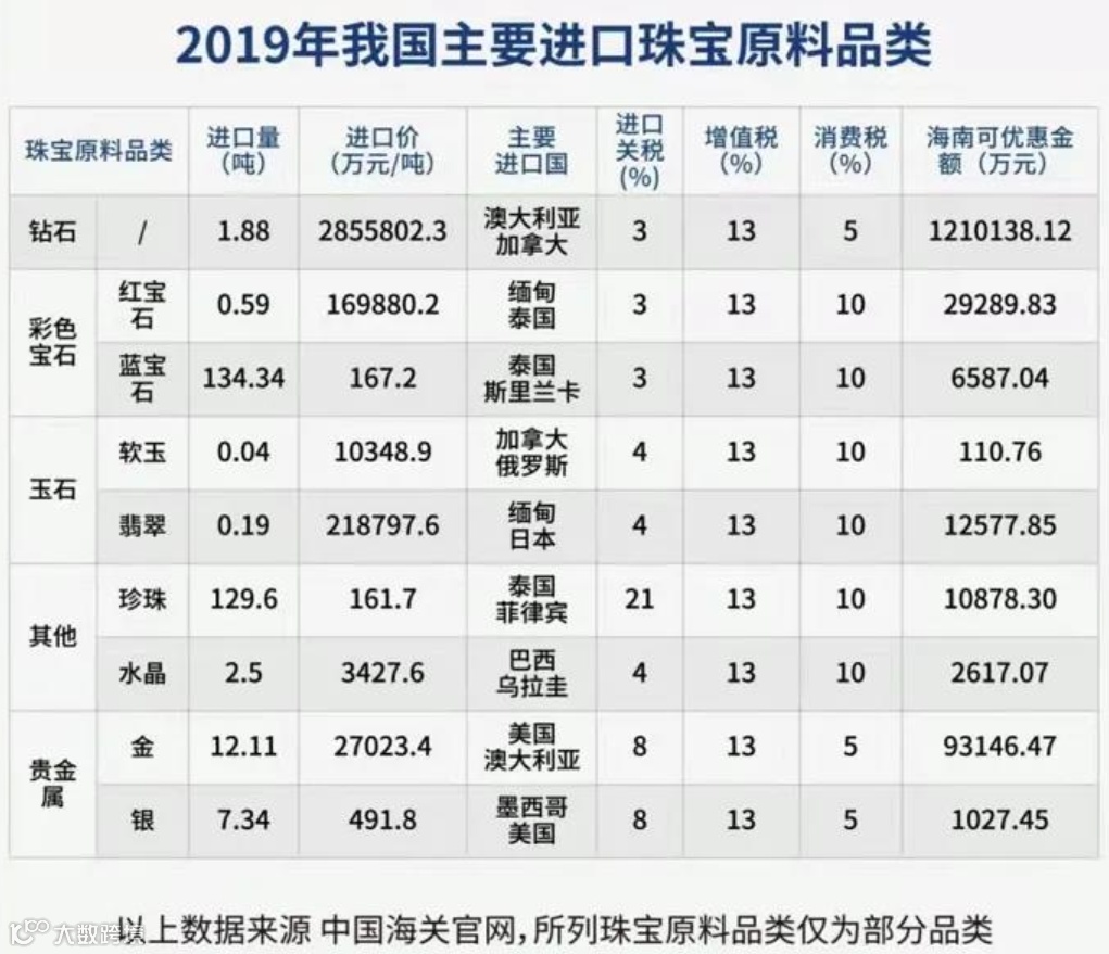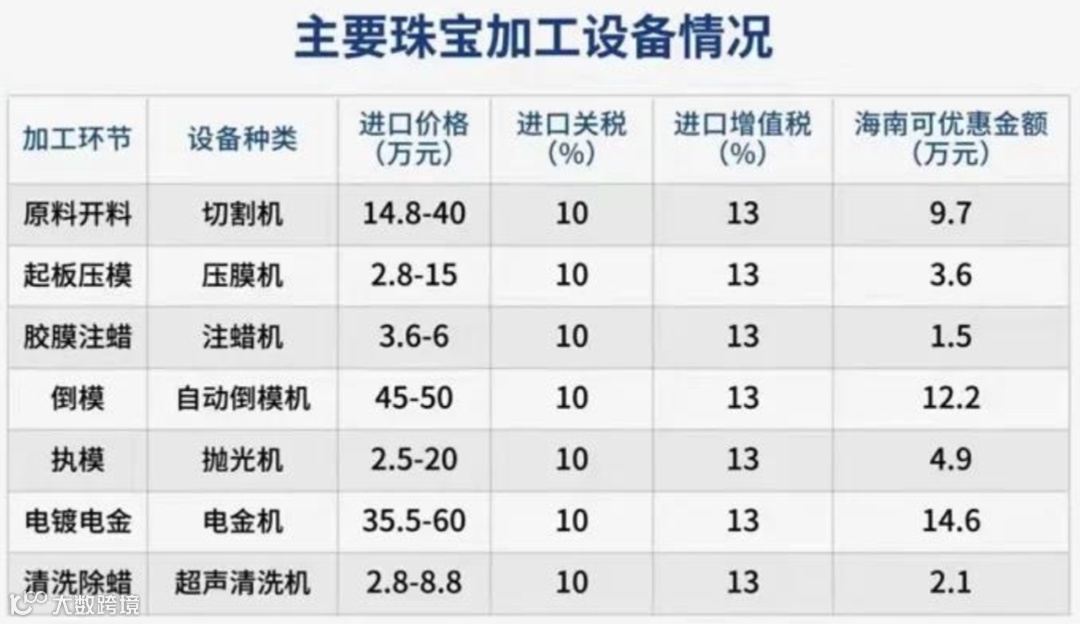 海南自由贸易港零关税政策下的优惠金额取珠宝原料加工制造设备进口价格区间的上限统一估算