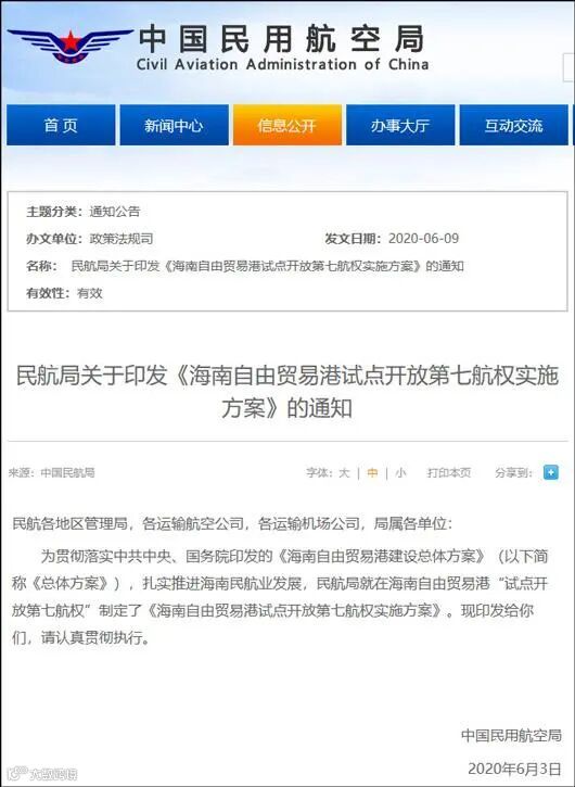 2020年6月9日,民航局在其官网发布关于印发《海南自由贸易港试点开放第七航权实施方案》(下称《实施方案》)的通知。根据《实施方案》,民航局在现有航权安排之外,鼓励并支持指定的外国空运企业在海南省具有国际航空运输口岸的地点经营第三、四、五航权以及试点经营第七航权的定期国际客运和/或货运航班,第七航权航班每条航线客、货总班次最高每周分别为7班。