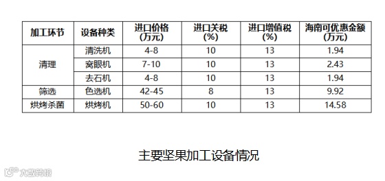 基于对目前我国主要坚果加工制造设备进口价格的调研,结合对海南自贸港零关税政策下进口设备关税减免的综合评估可知,坚果加工企业采购单套加工设备可实现约30.81万元成本降低,具有明显的经济性优势。