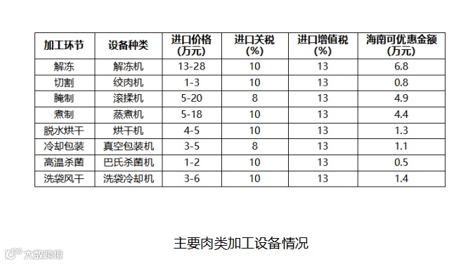基于对目前我国主要肉类加工制造设备进口价格的调研,结合对海南自贸港零关税政策下进口设备关税减免的综合评估可知,肉类加工企业采购单套加工设备可实现约21.2万元成本降低,具有明显的经济性优势。