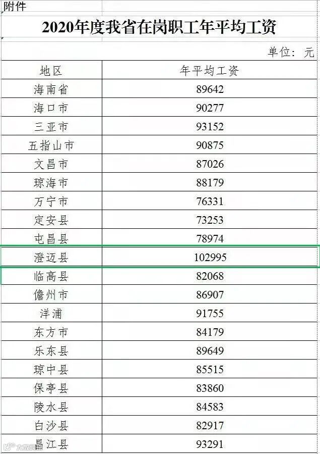 9月8日,海南省人力资源和社会保障厅公布了《2020年度我省在岗职工平均工资》。数据显示,2020年度全省在岗职工年平均工资为89642元,其中,澄迈县在岗职工年平均工资在全省居于首位,达10.2995万元。