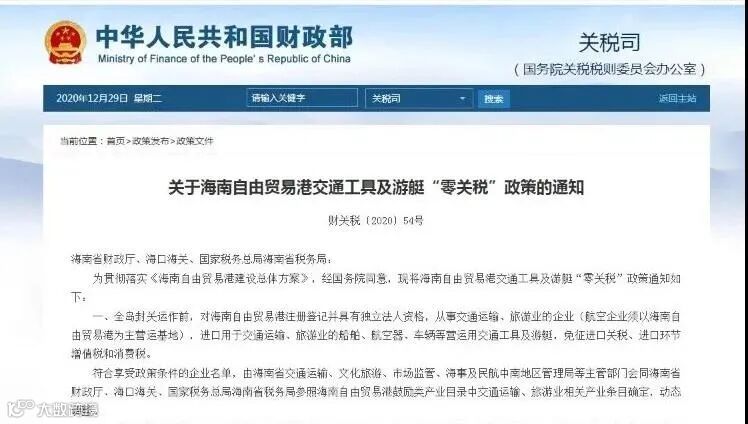 关于海南自由贸易港交通工具及游艇“零关税”政策的通知