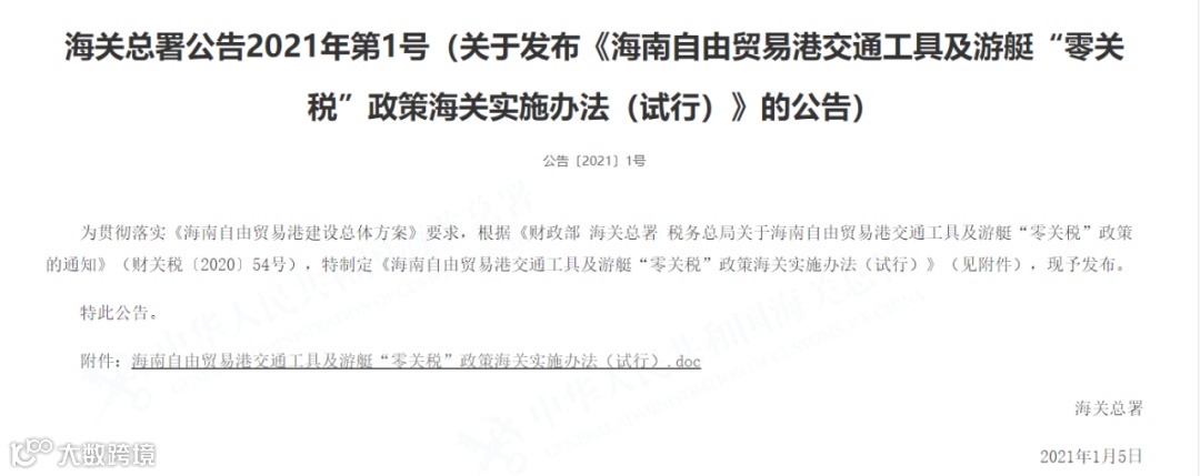 为贯彻落实《海南自由贸易港建设总体方案》要求,根据《财政部 海关总署 税务总局关于海南自由贸易港交通工具及游艇“零关税”政策的通知》(财关税〔2020〕54号),特制定《海南自由贸易港交通工具及游艇“零关税”政策海关实施办法(试行)》(见附件),现予发布。