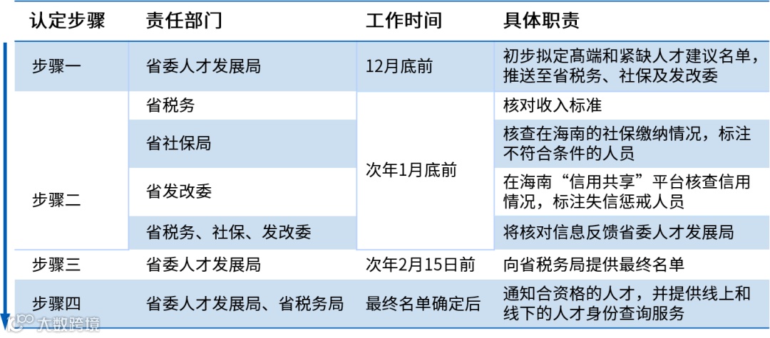 由省委人才发展局初拟的人才名单、省税务局核对收入情况、省社保局核查社保缴纳情况并标注不合格人员、省发改委核查信用情况并标注失信惩戒人员,到整合各部门意见后确定最终人才名单,并通过《致海南自由贸易港高端紧缺人才的一封信》或短信方式通知合资格的人才本人,全程个人无需额外准备资料提出申请 -