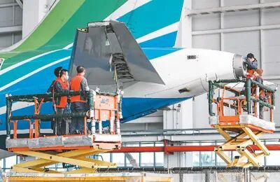 2021年1月15日,在海口美兰国际机场,维修人员对一架空客A320-232飞机进行高级别定检维修。定检服务用的航材中,进口的机身改装器材包、发动机油滤等原辅料享受“零关税”。