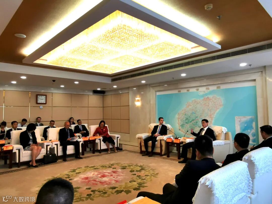2020年9月14日下午,海南省人民政府沈丹阳副省长在海口会见美中贸易全国委员会(USCBC)副会长马修·马古利斯一行,就自贸港最新政策及美资企业在海南布局等事宜进行了洽谈和交流。空气产品公司、嘉吉公司、联邦快递、美国艾柯斯科能源与资源合伙企业、安利公司、宝洁公司、富美实公司、因美纳公司等多家美国企业参加座谈。