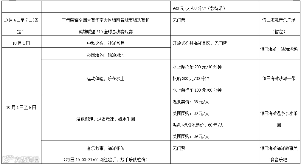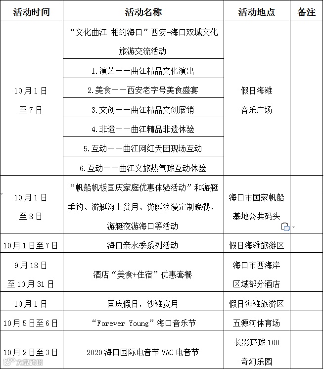海口市西海岸区域部分酒店纷纷推出酒店“美食+住宿”优惠套餐、在五源河体育场将举行“Forever young”海囗音乐节、在长影环球100奇幻乐园举行2020海口国际电音节VAC电音节等系列活动。