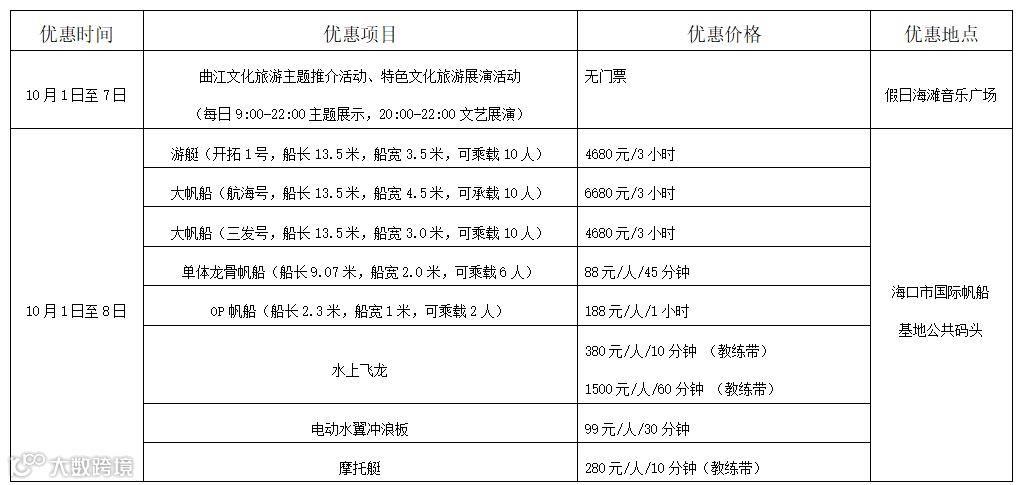 “两节”期间(10月1日--8日),“文化曲江 相约海口”西安-海口双城文化旅游交流活动在海口假日海滩旅游区举行,全程贯穿演艺——曲江精品文化演出、西安老字号美食盛宴、曲江精品文创展销、曲江精品非遗体验、曲江网红天团现场互动、曲江文旅热气球互动体验;假日海滩音乐广场有海南特色歌舞、仿唐歌舞、潮流乐队表演等文化交流活动;在海口市国际帆船基地公共码头还有帆船帆板国庆家庭优惠体验活动和游艇垂钓、游艇海上赏月、游艇浪漫定制晩餐等活动。