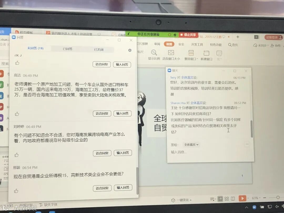 学员们通过个人线上账户登录、单位统一组织集中学习等方式积极参与,并通过在线问答、留言等方式与老师进行互动。现场提问、留言主要聚焦于原产地规则、零关税政策、跨境电商产业发展趋势、离岛免税等相关政策热点,王鹏老师针对学员重点关注问题一一进行详细解答。