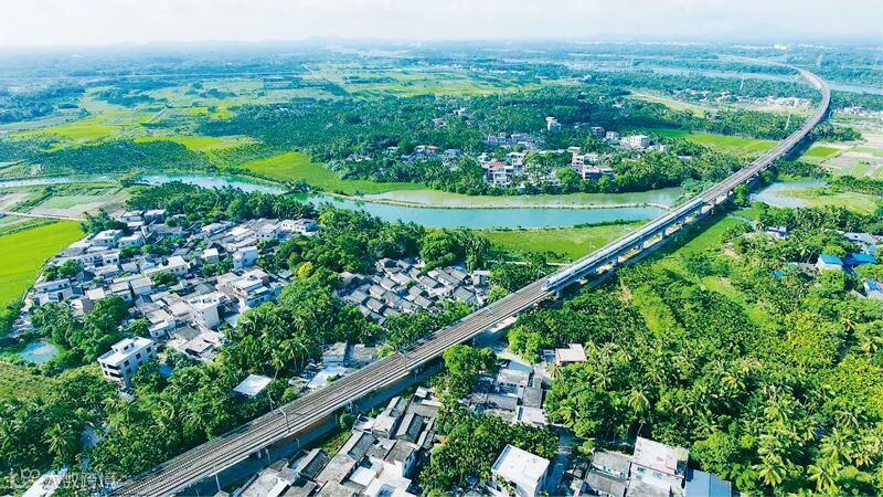 近年来,海南以自贸试验区建设为主抓手,着力补短板强弱项,不断夯实自贸港建设基础。从2020年7月10日0时起,海南环岛高铁、海口市郊列车实施新列车运行图。图为2020年7月10日,海南环岛高铁一列动车从琼海市经过。人民图片 蒙钟德/摄