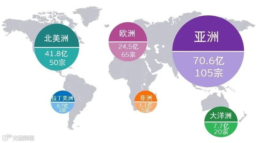 ► 按交易数量计,前三大行业TMT、金融服务业及先进制造与运输业,共占总量的54%;其中,金融服务业并购数量同比增长一倍,四成布局在亚洲地区。