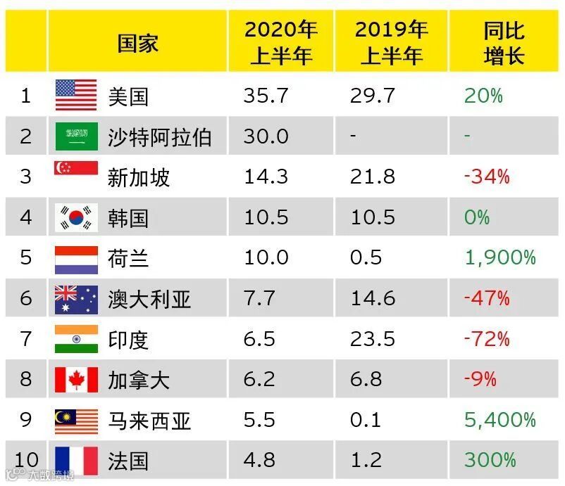 图表5:2020年上半年中企宣布的海外并购前十大目标国家(亿美元)