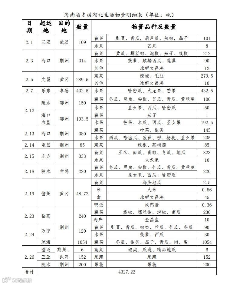 根据海南省委省政府有关部署,海南省商务厅与湖北省商务厅紧密联系,多方协调、统筹调度,做好支援湖北省疫区市县对口安排,并会同农业、交通等部门以及三亚、海口、文昌、乐东四地,安排财政资金用于收购海南果蔬,组织货值约1000万元的1235吨优质农产品分4批次捐赠湖北疫情严重地区。随后,海口、三亚、陵水、澄迈、儋州、屯昌、东方、临高、琼海等市县积极响应,“以购代捐”的方式采购优质农产品支援湖北疫区,截至2月26日,共支援湖北对口市县13批次4327吨优质农产品。近期,将继续对接湖北省商务厅,根据需求情况,持续组织优质农产品对口捐赠湖北疫区。