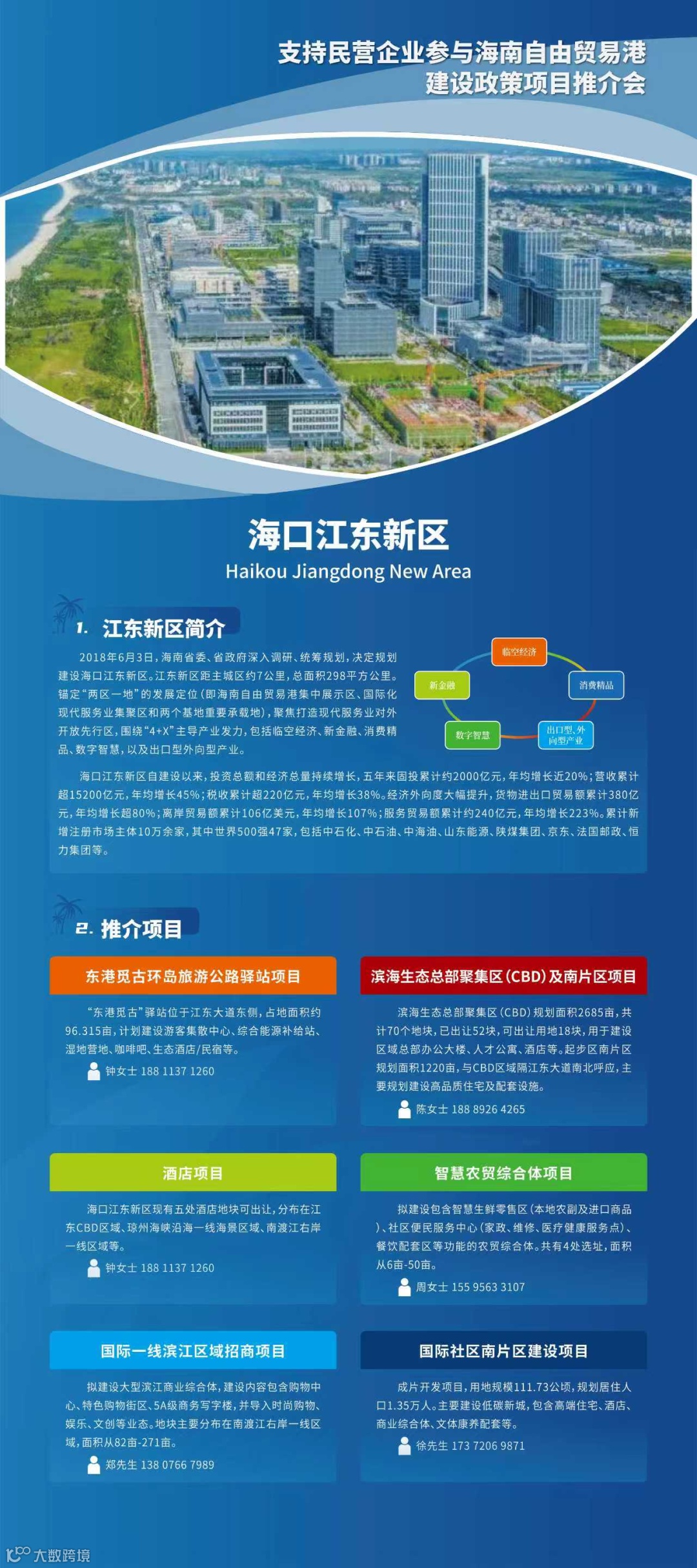 2018年6月3日,海南省委、省政府深入调研、统筹规划,决定规划建设海口江东新区。江东新区距海口市主城区仅7公里,总面积298平方公里,锚定“两区一地”发展定位(“海南自由贸易港集中展示区”“现代服务业对外开放先行区”“两个基地重要承载地”),聚焦打造现代服务业对外开放先行区,围绕“4+X”主导产业发力,包括临空经济、新金融、消费精品、数字智慧及出口型、外向型产业企业。江东新区自建设以来,投资总额和经济总量持续增长,累计实现固投约2000亿元,年均增长近20%;营收累计超1.5万亿,年均增长45%;税收累计超220亿元,年均增长38%。经济外向度大幅提升,货物进出口贸易额累计近400亿元,离岸贸易额超100亿美元,跨境服务贸易额累计约240亿元。累计新增市场主体10万家,其中世界500强企业达到48家,包括中石化、中石油、中海油、华电集团、国电投集团、国能集团、山东能源、陕煤集团、美国嘉吉、法国邮政、京东、恒力等在内的多家龙头。