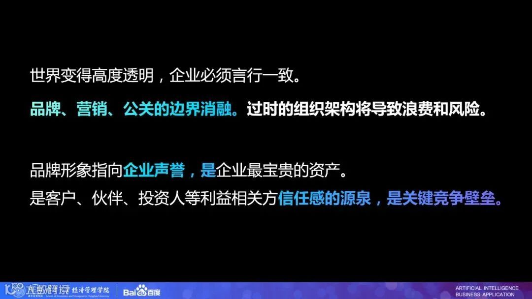 最后我想说,世界变得高度透明,企业必须做到言行一致,才会拥有好的品牌。对于管理者来讲,也需要理解,品牌、营销、公关的边界在消融,组织架构需要与时俱进,过时的组织架构将导致浪费和风险。品牌形象其实最终指向企业信誉,是企业最宝贵的资产,是客户、伙伴、投资人等利益相关方信任感的源泉,是关键的竞争壁垒。