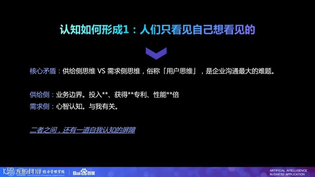 两者之间,还有一个自我认知的屏障。企业和个人都是一样的,我们通常认为自己比自己实际情况更好,这个屏障进一步障碍了我们的有效沟通。企业沟通最大的问题,所有的企业都一样,包括百度等其它企业,喜欢秀肌肉,喜欢讲我很厉害,这叫供给侧思维严重,用户一脸懵,不知道你在说什么。