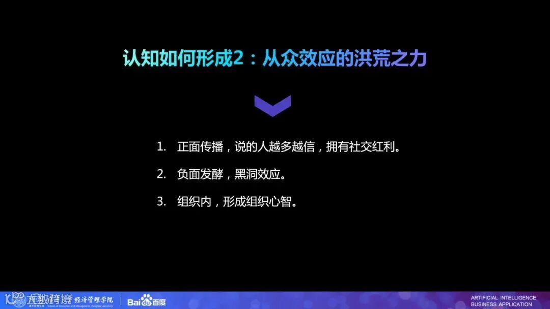 第二个很重要的、影响人们心智认知的是“从众效应”。一个认知形成的过程很复杂,有一些是很难去抵抗的。但你了解这些之后,去认识自己或者做管理,都是有价值的。这就是在最终的心智形成过程中,一家企业或者一个品牌,正面传播说的人越多越信,拥有社交红利。这是指,当越多人在讲肯定的话的时候,你愿意去分享,得到支持的可能更大。那负面同样如此,当负面被反复地说的时候,那讲负面会成为一种政治正确。负面发酵,形成黑洞效应。当你是一个企业家,你在做组织管理的时候,也要去关注。当一个企业经常在鼓励一种行为的时候,时间长了会形成组织心智。