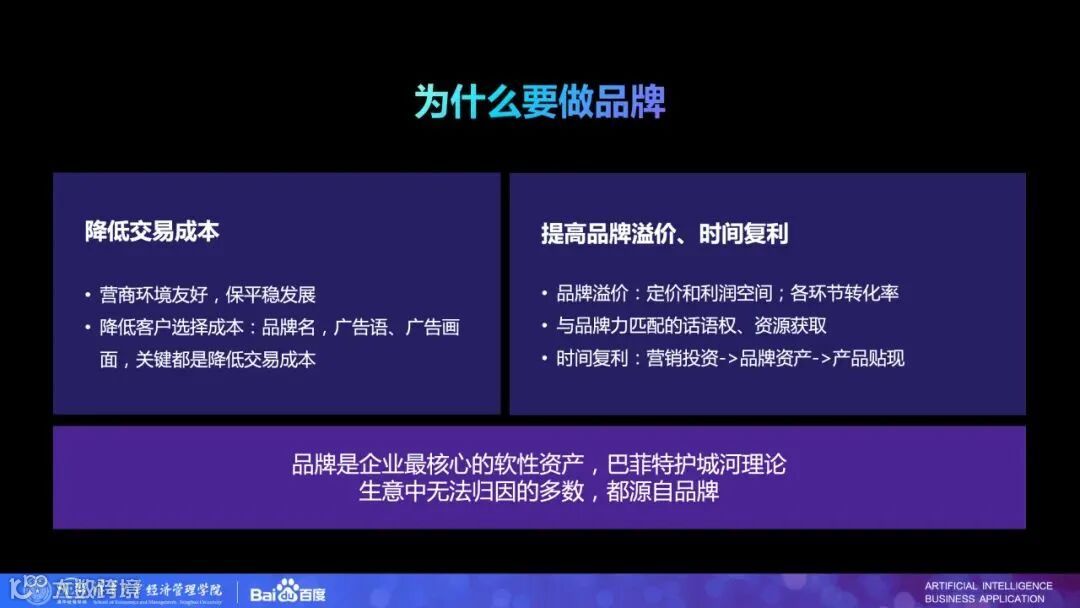未来当你在做营销管理的时候要去考虑,比如说一个品牌名,一句广告语,不要去问好不好听,是不是很特别,它最大的价值应该是降低用户的交易成本,应该一听就知道你到底在提供什么样的价值,同时能提高品牌溢价,提高各环节的转化率,获得与品牌力匹配的话语权,以及资源获取的能力。