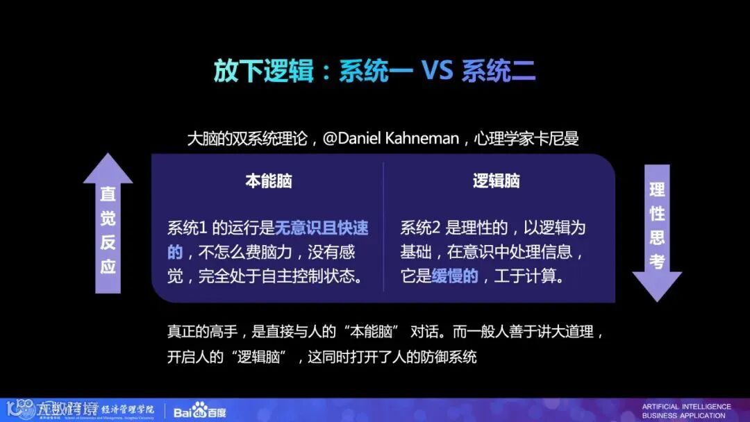 底层的原理其实是卡尼曼的大脑双系统理论,有一本书叫《思考,快与慢》。它讲的就是我们所有人的大脑都是这么运作的,你有个系统 1,它的运行是无意识且快速的,不怎么费脑子,没有感觉,完全属于自主控制状态;系统 2 是理性的,以逻辑为基础,在意识中处理信息,它的缓慢的,工于计算。