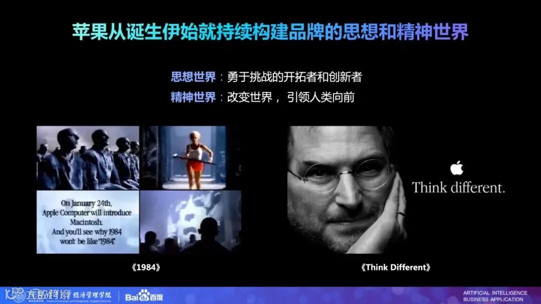 苹果有一些非常经典的广告,比如《1984》、《think different》,都非常深入人心。苹果从诞生伊始,就持续构建品牌的思想和精神世界。它构建的思想世界,是勇于挑战的开拓者和创新者;它构建的精神世界,是改变世界,引领人类向前。这样的理念和价值主张,是跨人群、跨国度的普世价值。