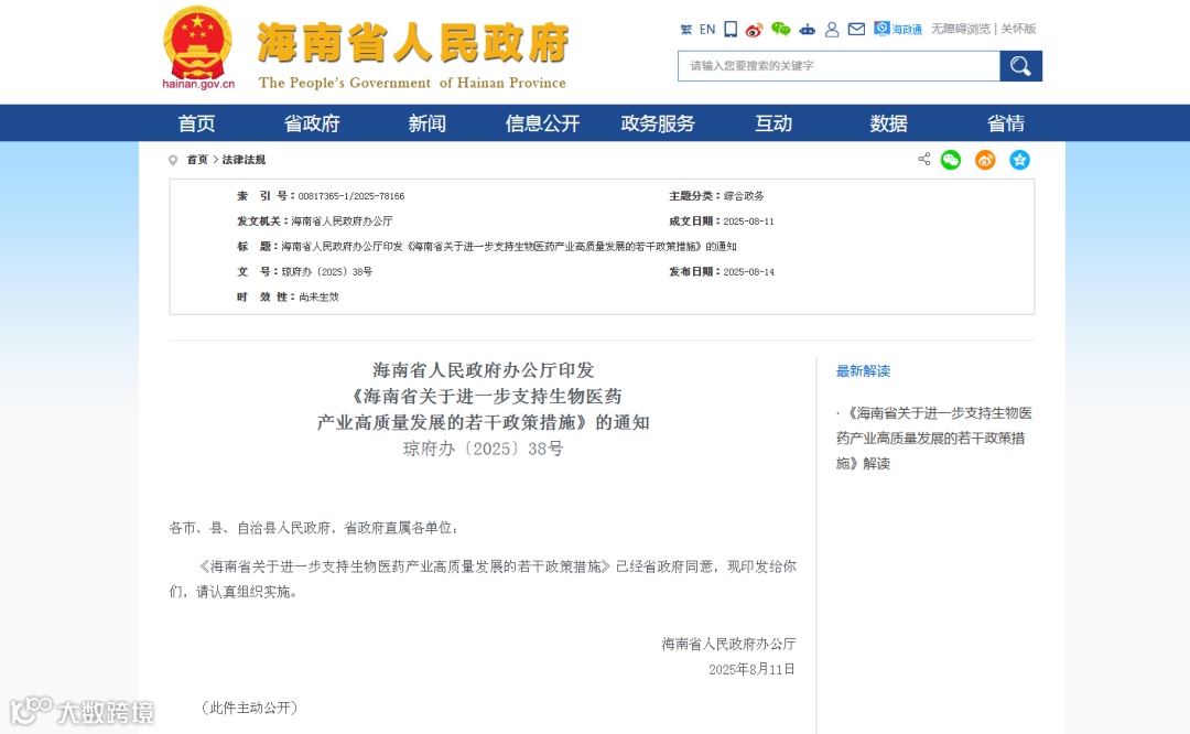为贯彻落实国家关于《全链条支持创新药发展实施方案》《支持创新药高质量发展的若干措施》《医药工业数智化转型实施方案(2025-2030年)》等有关要求,充分发挥海南自由贸易港独特优势,加快构建集“研发、临床、制造、要素、机制”于一体的全产业链政策支撑体系,打造具有核心竞争力的生物医药产业集群,我省制定了《海南省关于进一步支持生物医药产业高质量发展的若干政策措施》。