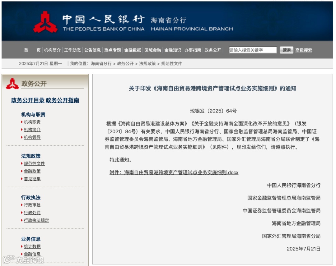 新政速递|央行发布《海南自由贸易港跨境资产管理试点业务实施细则》