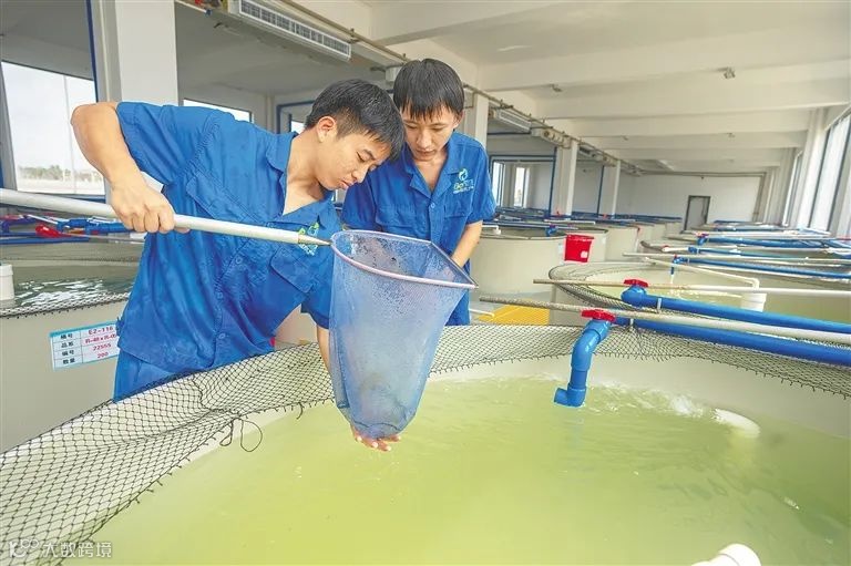 工作人员在文昌市冯家湾现代化渔业产业园的渤海水产虾苗养殖车间巡查养殖池。海南日报记者 袁琛 摄
