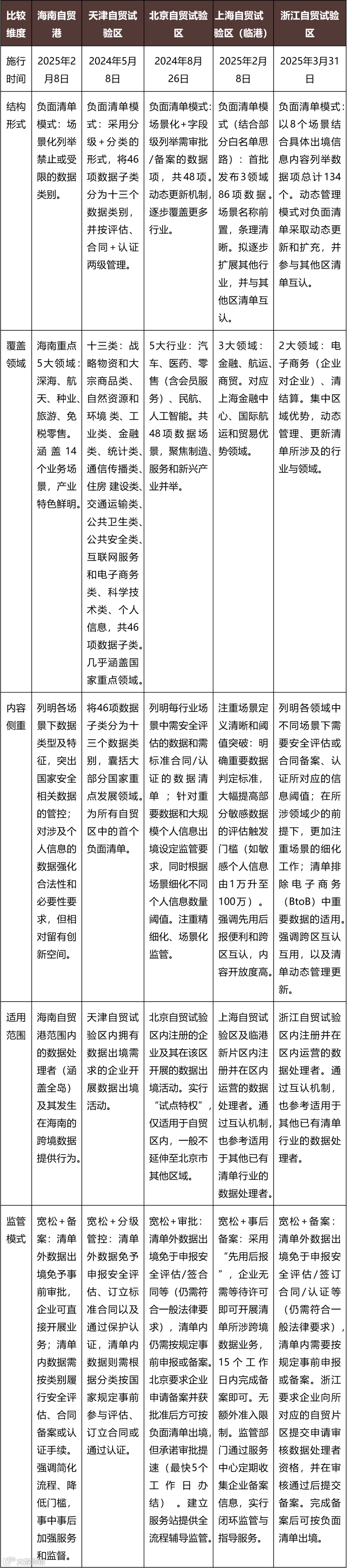 国家互联网信息办公室于2024年发布《促进和规范数据跨境流动规定》(下称“数据跨境规定”),明确自由贸易试验区可自行制定数据出境“负面清单”特别机制。此后天津、北京、上海、海南、浙江等地相继出台各自的数据出境管理负面清单,以在国家统一法规框架下探索更便利的跨境数据流动政策。