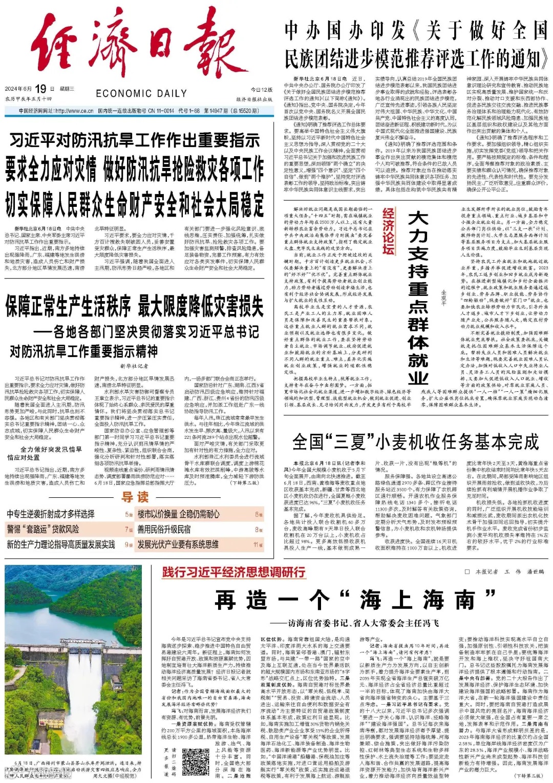 二是产业强海,构建现代化海洋产业体系。我们充分发挥自身优势,改造提升传统产业,壮大新兴产业,培育未来产业,推动海洋经济高质量发展。比如,引导渔民“往岸上走、往深海走、往休闲渔业走”,大力发展水产种业、深远海养殖,推动传统渔业转型升级,2023年全省新增深远海养殖水体30万立方米,养捕比优化至4∶6,休闲渔业产值增长90%。比如,积极发展海上风电产业,开工建设3个海上风电示范项目,儋州洋浦、东方海上风电装备制造基地建设有序推进,全球最大风轮(292米)叶片成功下线,探索“海上风电+海洋牧场+制氢储能”发展模式。还比如,全球首个商用海底数据中心投入运营,探索“海洋经济+数字经济”新赛道,等等。我们将抓住封关运作带来的战略机遇,用足用好自贸港政策,重点培育深海油气、海洋可再生能源、海洋工程装备技术、海洋生物技术等四大海洋新兴产业,做优做强海洋旅游、海洋渔业、海洋交通运输、海洋油气及化工等四大传统产业,积极抢占海洋信息与大数据产业、深海科技等新领域新赛道,加快发展海洋金融、海商海事等现代海洋服务业,打造海洋油气化工、海洋旅游文体、海洋生物、海洋清洁能源等产业集群,着力构建现代化海洋产业体系,为再造“海上海南”筑牢产业根基。