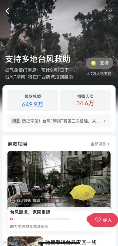 9月11日,北京字节跳动公益基金会宣布捐赠500万元人民币,联合中国教育发展基金会、中国乡村发展公益基金会等公益机构,支持海南、广东等受灾严重的地区开展道路清障、校园修缮等灾后恢复重建工作。此外,字节跳动公益平台同步启动应急响应机制,上线相关救灾公益项目,开展专题筹款,增加捐赠入口,支援应急救灾工作。