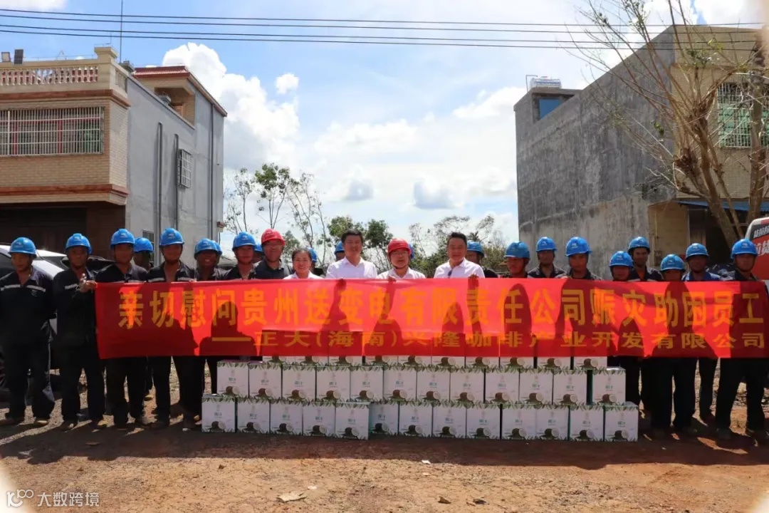 正大(海南)兴隆咖啡产业开发有限公司向抢修电力志愿者和灾区捐赠椰子汁280箱和4万元善款。