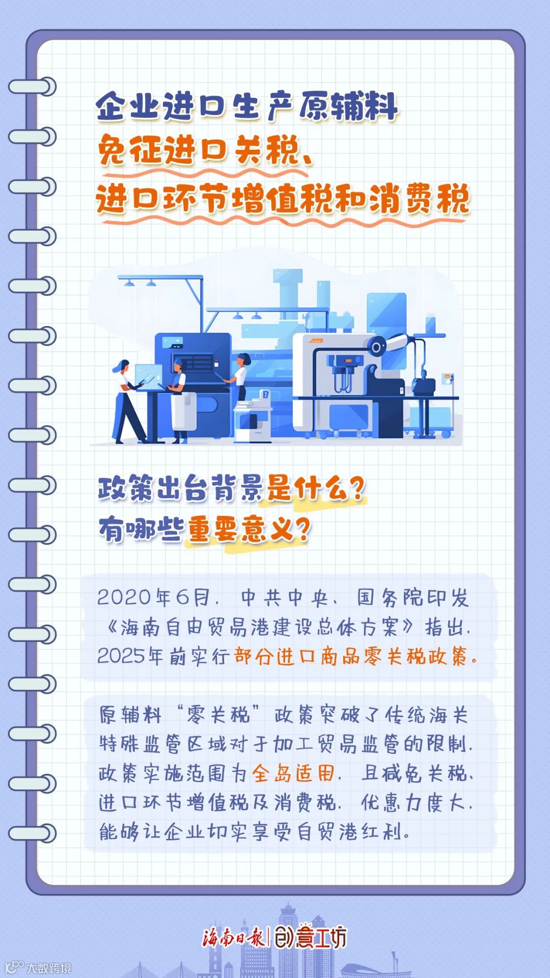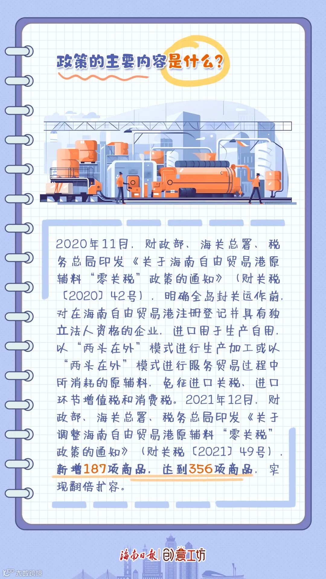 2020年11月,财政部、海关总署、税务总局印发《关于海南自由贸易港原辅料“零关税”政策的通知》(财关税〔2020〕42号),明确全岛封关运作前,对在海南自由贸易港注册登记并具有独立法人资格的企业,进口用于生产自用,以“两头在外”模式进行生产加工或以“两头在外”模式进行服务贸易过程中所消耗的原辅料,免征进口关税、进口环节增值税和消费税。2021年12月,财政部、海关总署、税务总局印发《关于调整海南自由贸易港原辅料“零关税”政策的通知》(财关税〔2021〕49号),新增187项商品,达到356项商品,实现翻倍扩容。