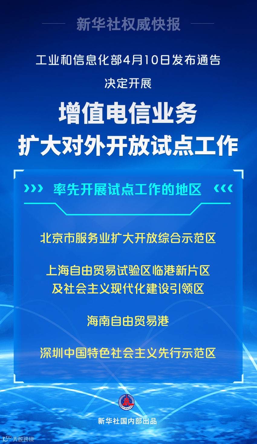 工业和信息化部4月10日发布《关于开展增值电信业务扩大对外开放试点工作的通告》,决定开展增值电信业务扩大对外开放试点工作。