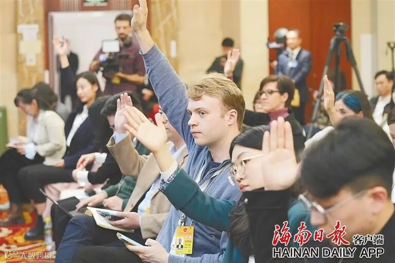 3月7日下午,出席十四届全国人大二次会议的海南代表团在住地举行开放团组活动。进入媒体提问环节,记者们争相举手提问。海南日报特派记者 封烁 摄