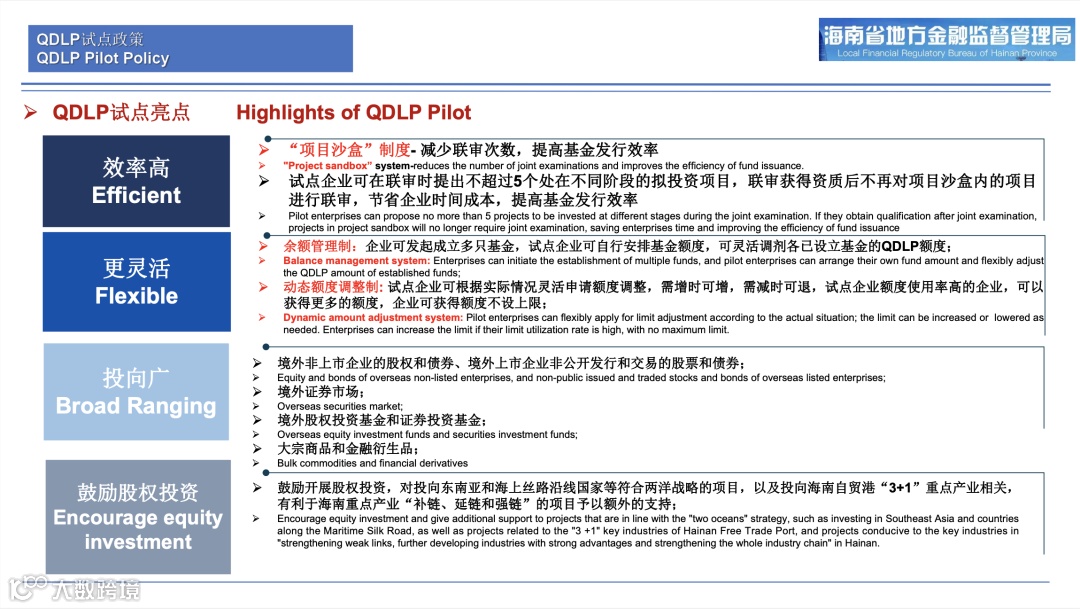 在QFLP和QDLP试点政策方面,管毅对“双Q”政策主要亮点和内容,特别是海南的优势进行了详细解读。